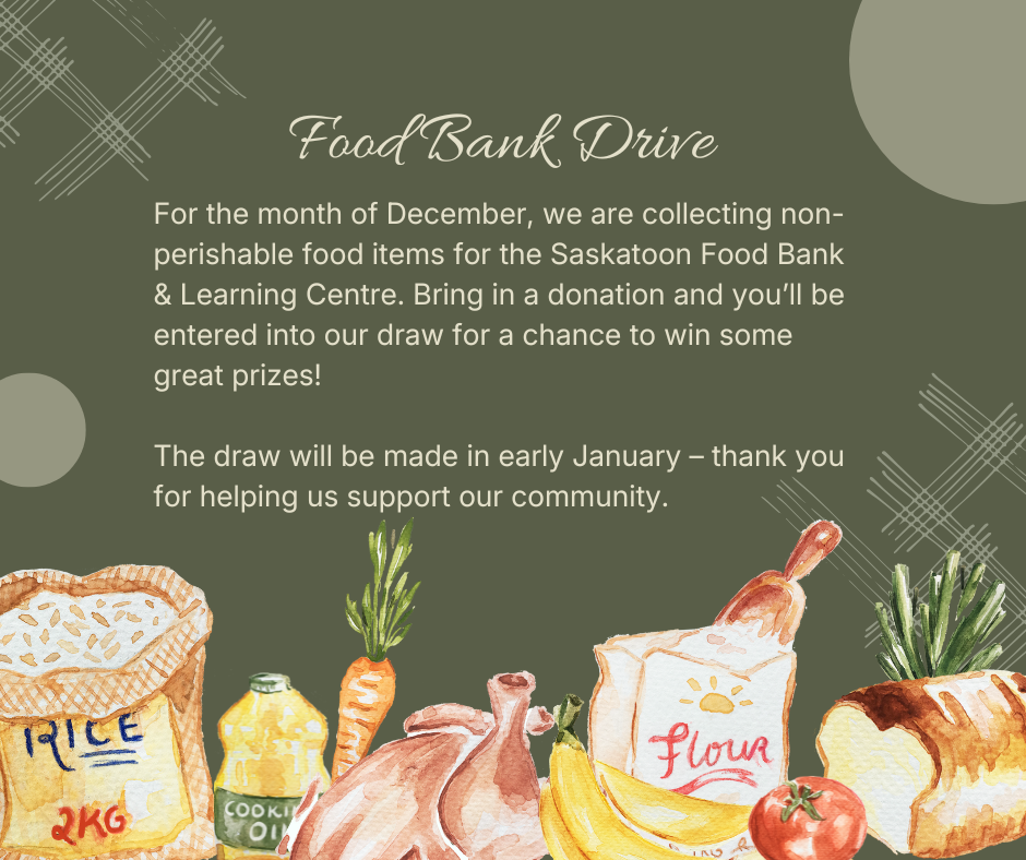 For the month of December, we are collecting non-perishable food items for the Saskatoon Food Bank & Learning Centre. Bring in a donation and you’ll be entered into our draw for a chance to win some great prizes! The draw will be made in early January – thank you for helping us support our community.